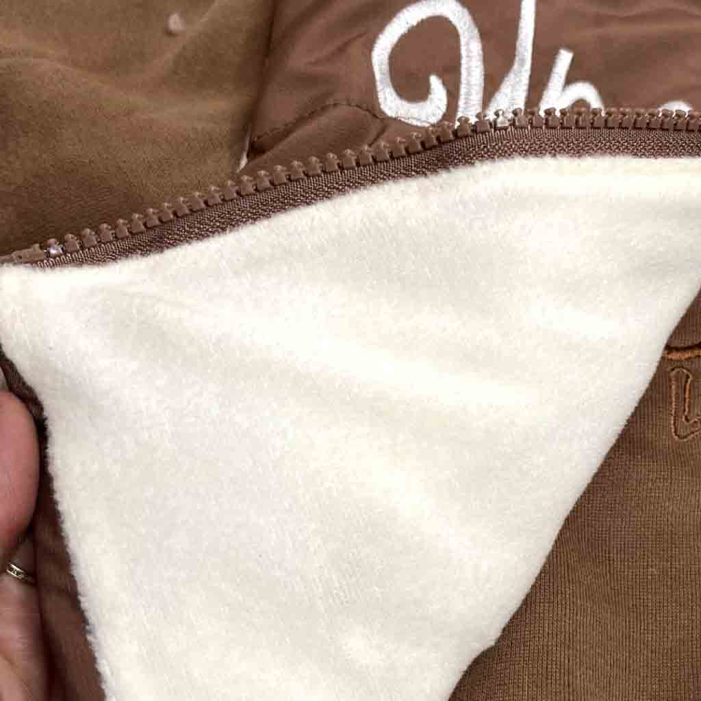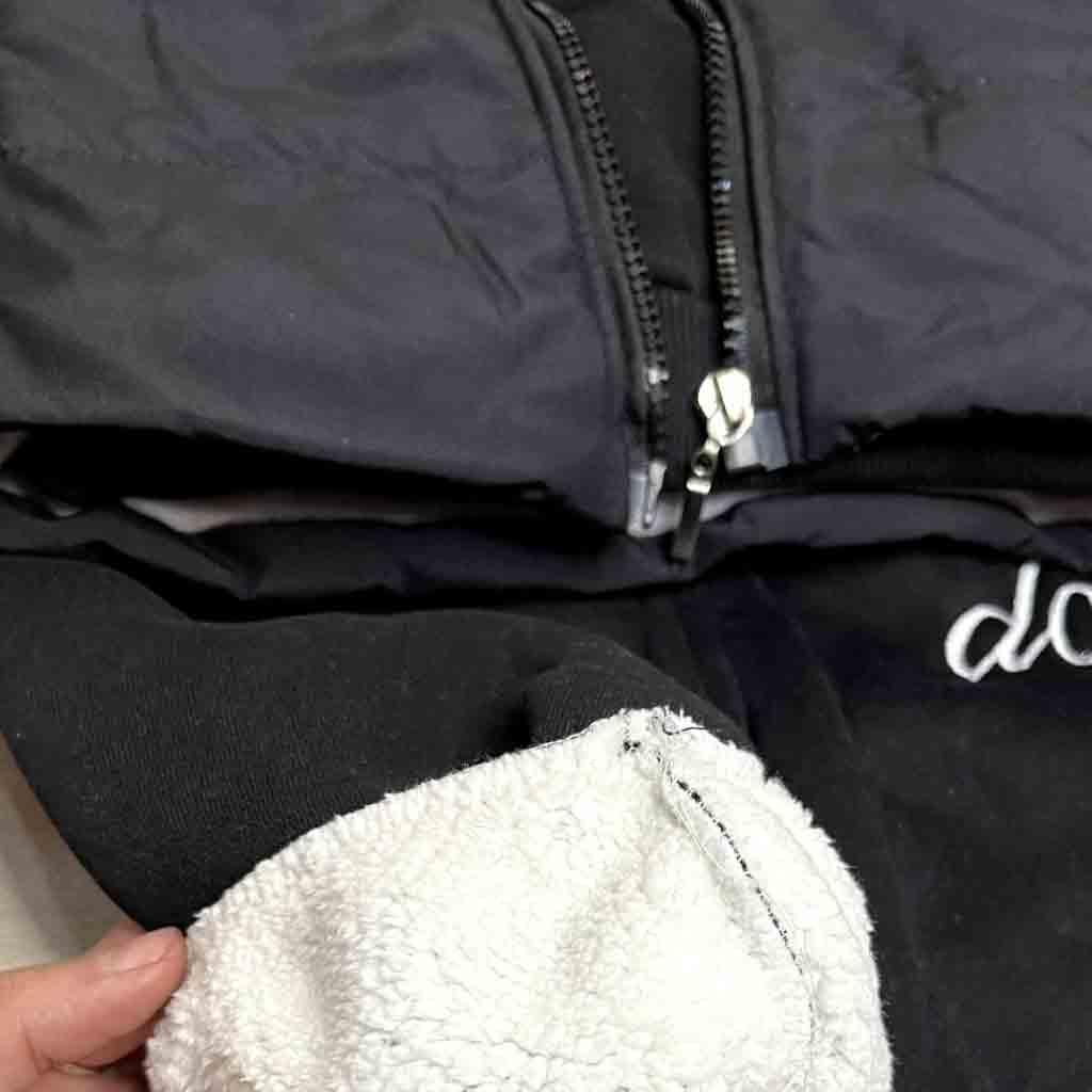 - کاپشن پف دار ،کلاه دار ،بلوز زیپ دار داخل کرکی و شلوار راحتی