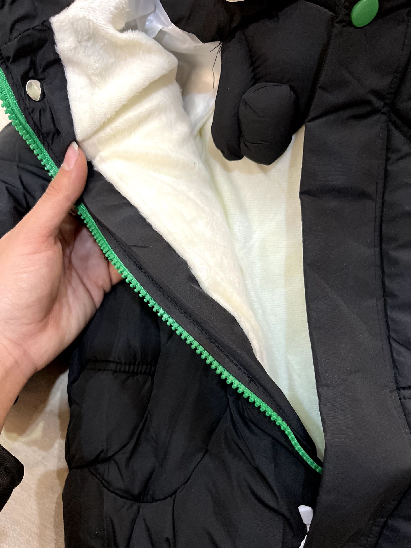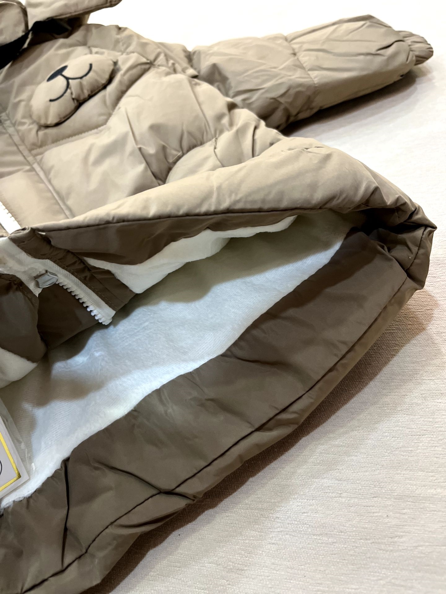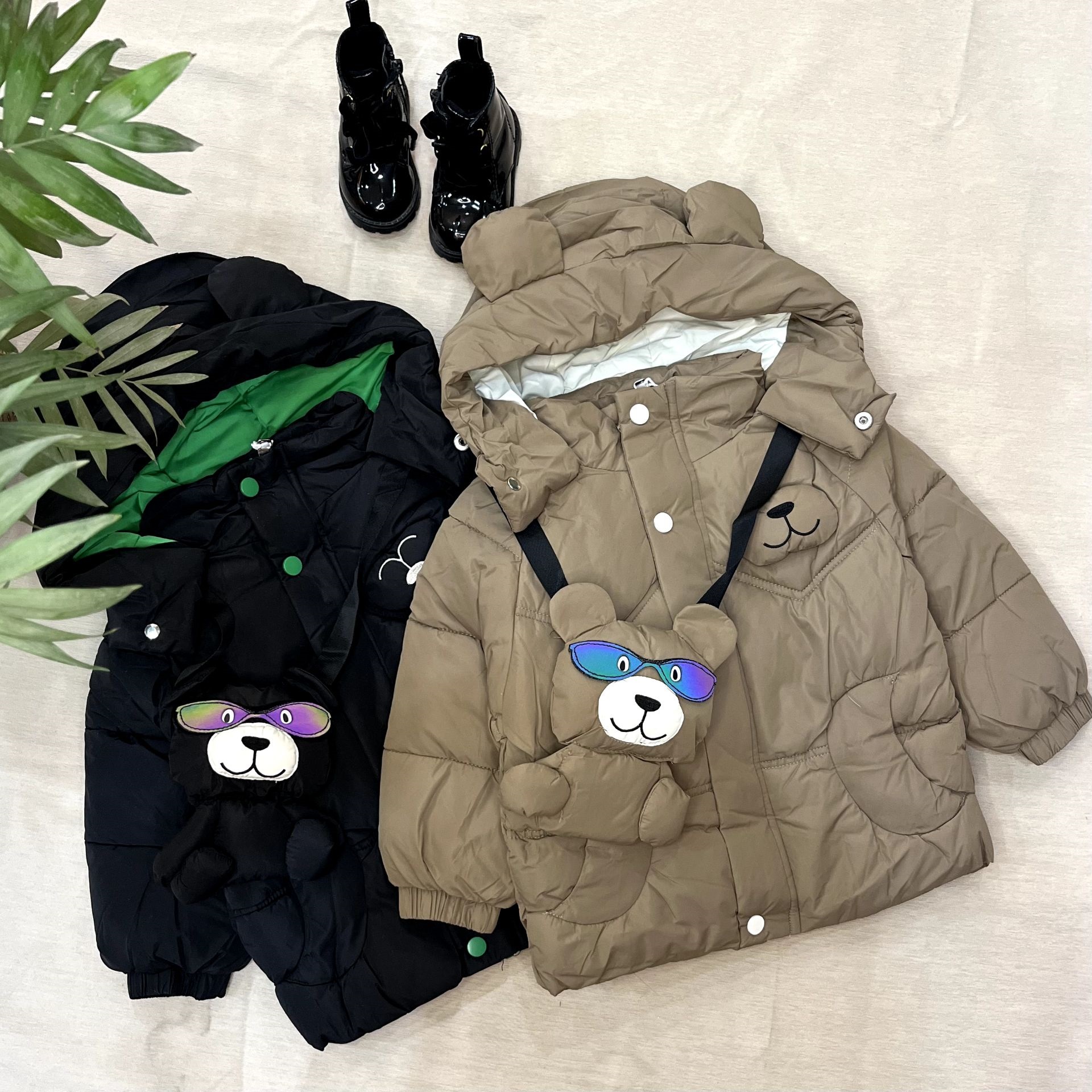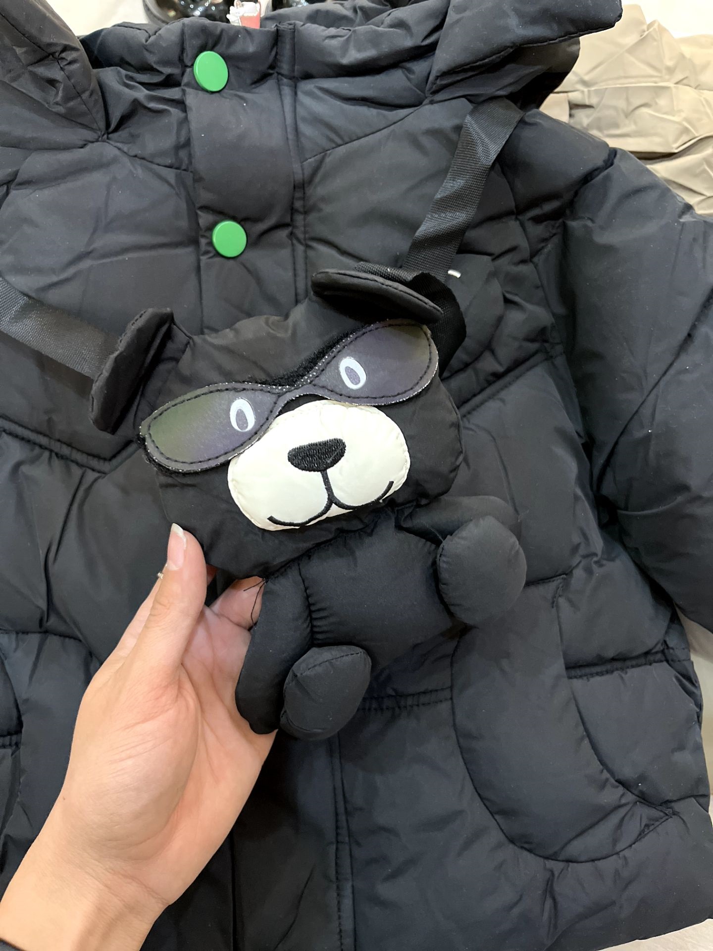 - کاپشن بچه گانه پافری با طراحی فانتزی خرس،دارای کلاه گوش دار و یک کیف کوچک خرس آویزدار